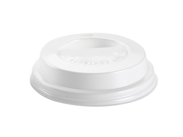 Tapa blanca de plástico para vaso de café grande, maxi, burbujas y ondas. Condiciones de uso y temperaturas: hasta 70ºC durante 30 min o 15 minutos a 100ºC.